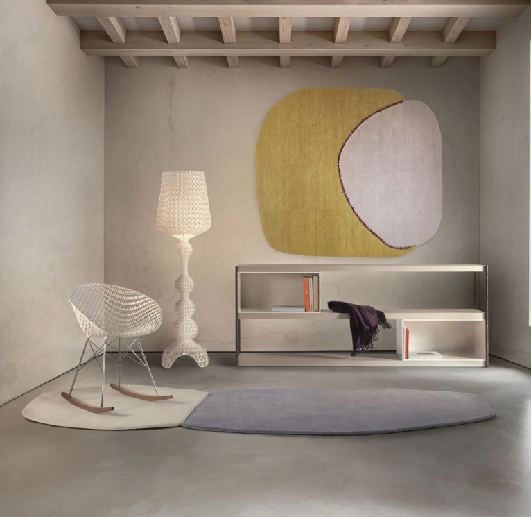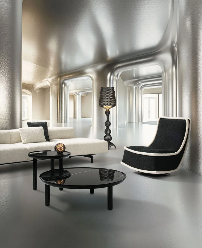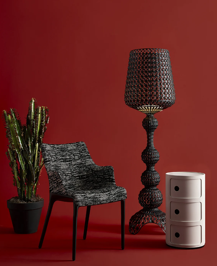 Le lampadaire Kabuki est moulé par injection. La technologie employée permet de créer une structure tissée semblable à la dentelle, avec une surface perforée unique qui diffuse la lumière. Disponible en versions intérieure et extérieure.