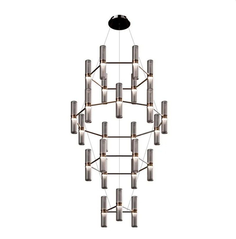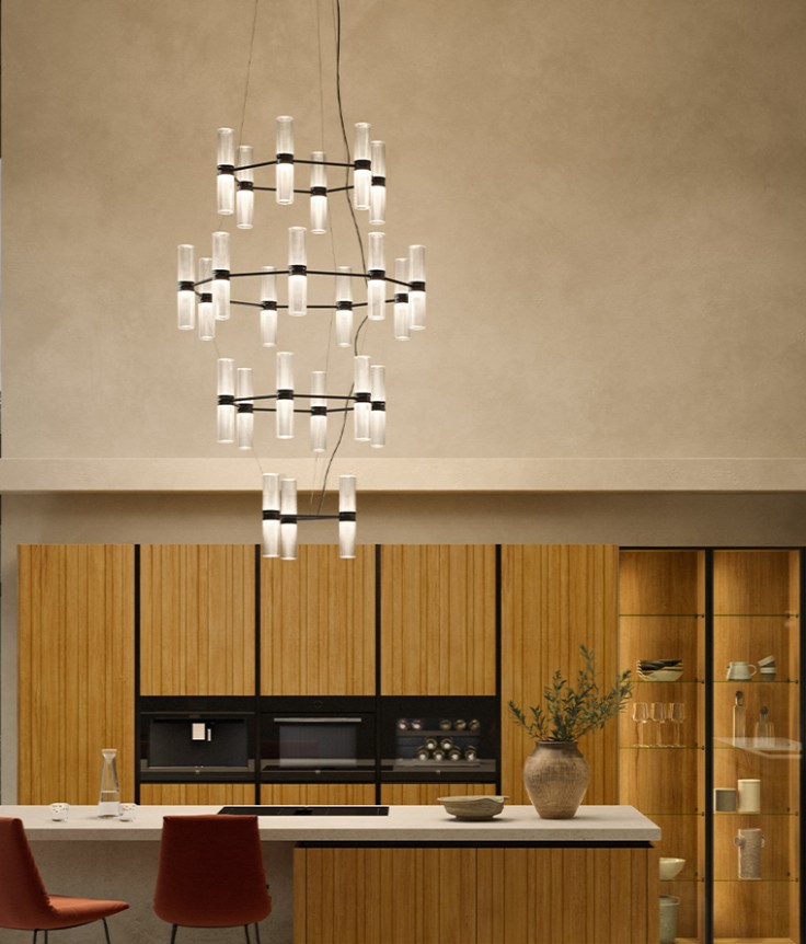 Il s'agit d'une interprétation contemporaine du lustre traditionnel : le savoir-faire du verre s'allie à une forme simple et à une esthétique raffinée pour réinterpréter les technologies de transformation du verre, non seulement à travers des pièces décoratives, mais aussi comme des outils fonctionnels de contrôle et de diffusion de la lumière.