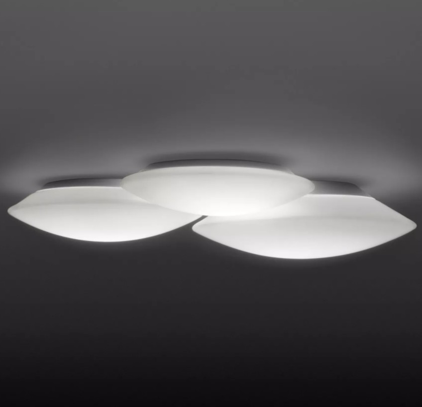 Plafond multiple à trois sphères conçu par Jordi Vilardell. L’emploi du verre opale triplex de très grande qualité et de l’aluminium injecté donne au produit une finition parfaite. Il fournit un éclairage chaud, sans ombres ni éblouissements.