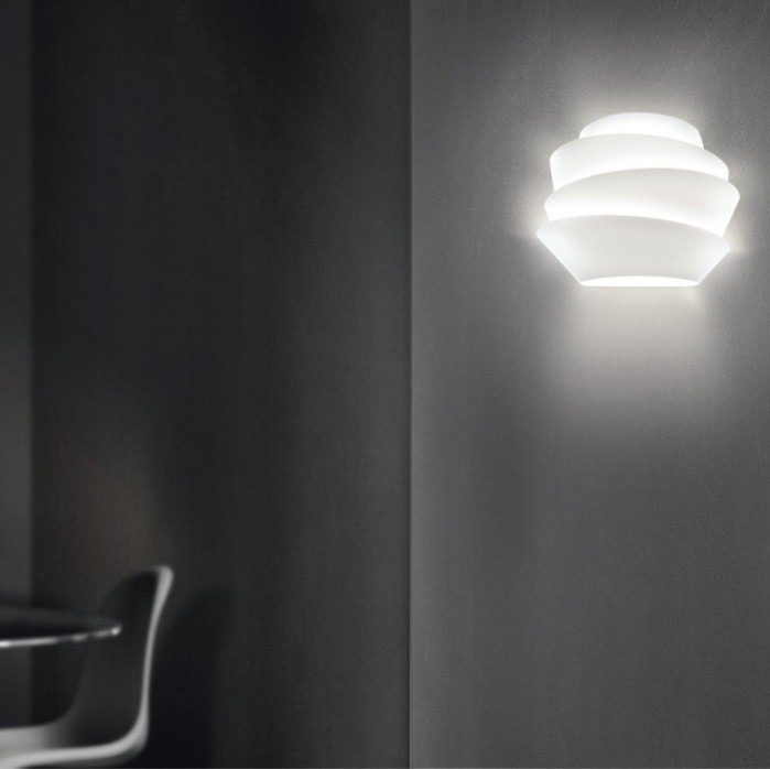 Le design composé de bandes asymétriques autorise filtrer une lumière chaude confère à l’applique Le Soleil une forte présence tout en maintenant une profondeur réduite.