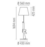 Lampadaire offrant une lecture directe et un éclairage ambiant. Le corps est en aluminium moulé sous pression avec un revêtement en polymère surmoulé et un fini plaqué or 18K ou chromé brillant. Abat-jour en papier plastifié noir mat avec sérigraphie dorée interne ou blanche avec sérigraphie interne argentée. Sur le câble il y a le gradateur électronique qui permet la régulation de la luminosité.