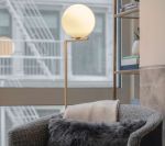 DESCRIPTION: Lampadaire à lumière diffuse. Cadre en laiton, brossé et verni transparent ou en acier chromé. Diffuseur opale en verre soufflé. Gradateur sur l'accord de puissance