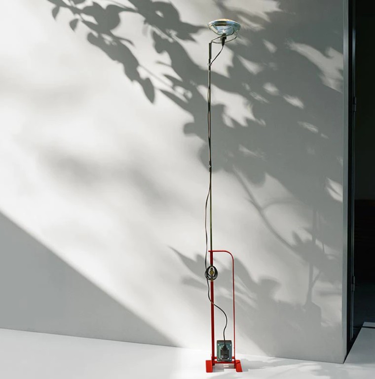 Lampadaire à lumière indirecte. Base en acier découpé et plié, structure en profilé d'acier, le tout recouvert d'une peinture liquide. Tige télescopique à section hexagonale en laiton nickelé, réglable en hauteur. Sur le câble il y a le dimmer électronique qui permet de régler pas à pas l'intensité lumineuse.