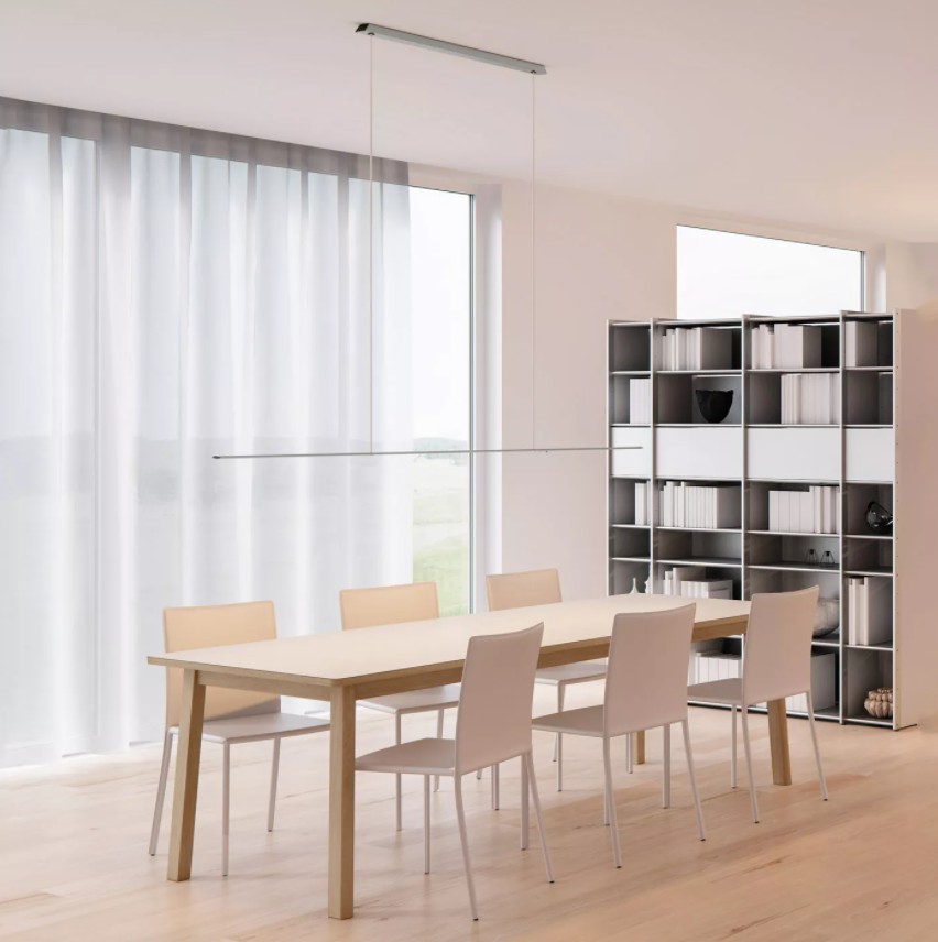 LET D 180 est un luminaire suspendu de forme linéaire pour léclairage de tables longues jusquà 300 cm. La tête filigrane du luminaire se trouve pratiquement invisible au-dessus de la surface de la table et fournit une lumière directe brillante avec une efficacité LED maximale. La lumière peut être variée en 5 niveaux avec le bouton sur la tête de luminaire.