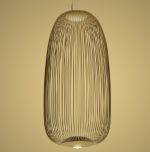 Spokes exprime une sensation de légèreté et de mouvement. Comme par magie, la lumière filtre de l’intérieur à travers une structure grillagée géométrique, projetant un kaléidoscope de vides et de pleins. La suspension Spokes 1 se distingue par sa forme allongée et dynamique.