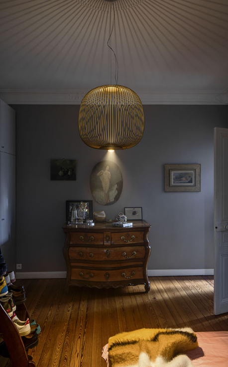 Spokes exprime une sensation de légèreté et de mouvement. Comme à travers une grille géométrique magique, la lumière filtre de l’intérieur, projetant un kaléidoscope de vides et de pleins. La forme de la lampe suspendue Spokes 2 fait penser à une lanterne ou à une volière.