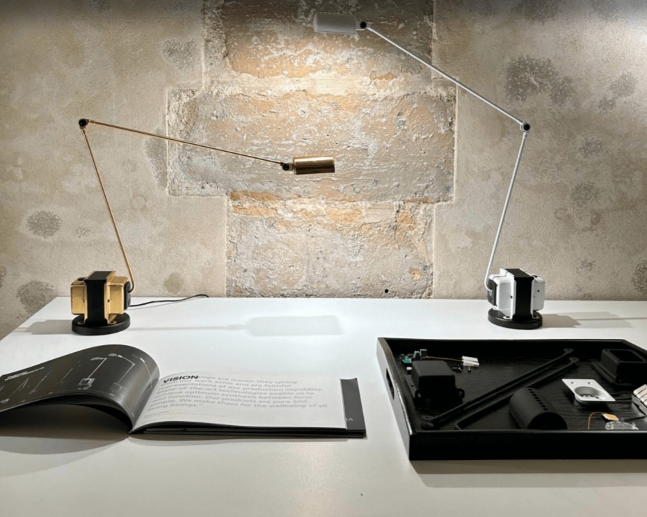 L'idée derrière la création de la lampe Daphine est aussi simple qu'efficace. un diffuseur pivotant, un bras articulé en deux segments et un transformateur électromécanique sur une base cylindrique entre deux calottes métalliques.