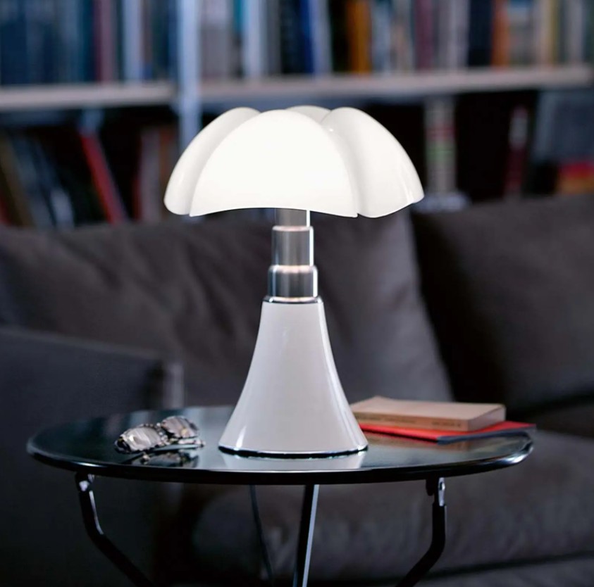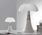 Version mini de la lampe BAT conçue par Gae Aulenti en 1965. Lampe de table à lumière diffuse. Structure en acier inoxydable, diffuseur en méthacrylate opalin blanc. Base et bouton: aluminium peint dans la nouvelle couleur vert agave / J / DIM / VE et dans la nouvelle finition laiton satiné / J / DIM / OT. Également disponible en aluminium peint dans la couleur standard: brun foncé / J / DIM / MA, blanc / J / DIM / BI, violet rouge / J / DIM / RO, titane / J / DIM / TI, cuivre / J / DIM / CU et doré / J / DIM / AU. Source lumineuse LED intégrée. Ballast électronique sur la prise.