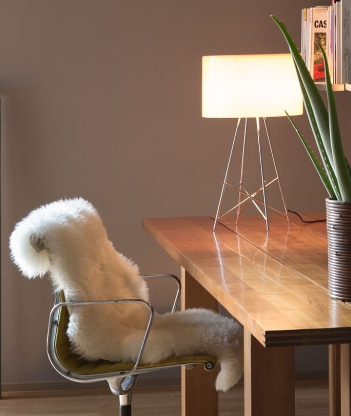Lampe de table à lumière diffuse. Le support de l'appareil est en tube d'acier de 10mm de diamètre, soudé, brossé et chromé. Disque support de diffuseur en alliage de zamac moulé sous pression, poli et chromé. Couverture douille en PA6 (Nylon) moulé par injection, de couleur blanche. Diffuseur interne en PC (polycarbonate) moulé par injection à 3%, de couleur opaline. Embouts de pieds en PVC élastique (chlorure de polyvinyle) moulé par injection, transparent. Le diffuseur externe est en plaque d'aluminium tourné peint en blanc mat à l'intérieur. Coloris extérieur : blanc ou noir brillant. Le diffuseur est en verre gris chemisé, soufflé à la bouche, finition externe brillante. Sur le câble il y a le dimmer électronique qui permet de régler pas à pas l'intensité lumineuse.